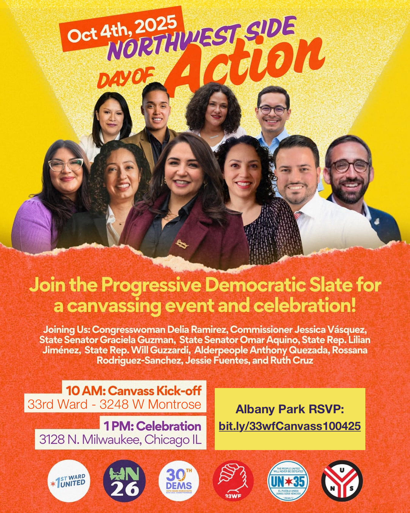 If you'd like to be a part of the movement, join us on Saturday, 10/04, at 10AM, at 3248 W Montrose Ave to hit some doors for our #ProvenProgressives: Delia Ramirez, Graciela Guzmán, and Jessica Vásquez! Afterward, we will meet up with our fellow Northwest Side progressives to celebrate at 1PM at 3128 N Milwaukee!